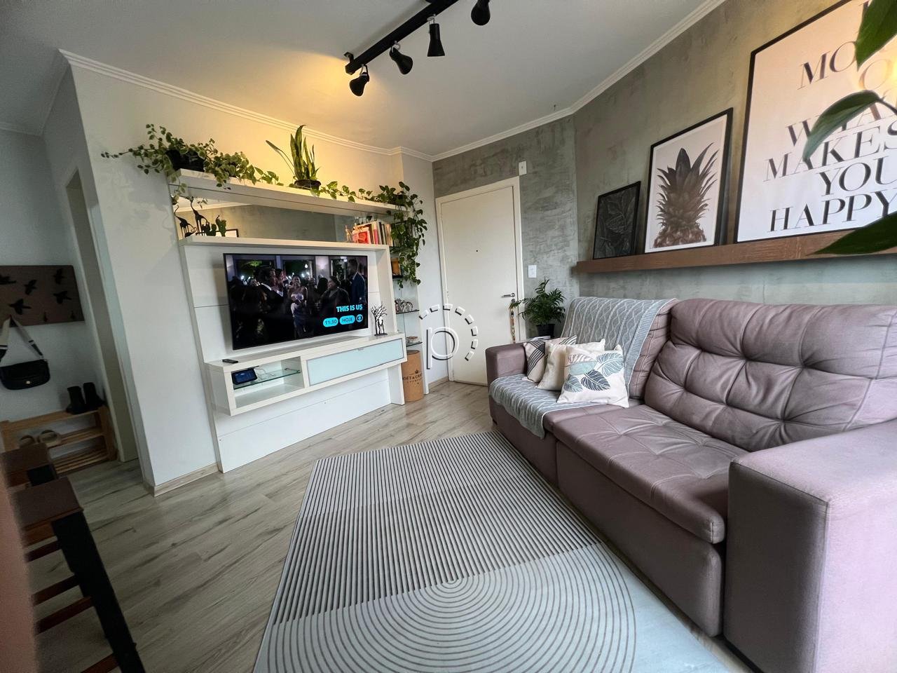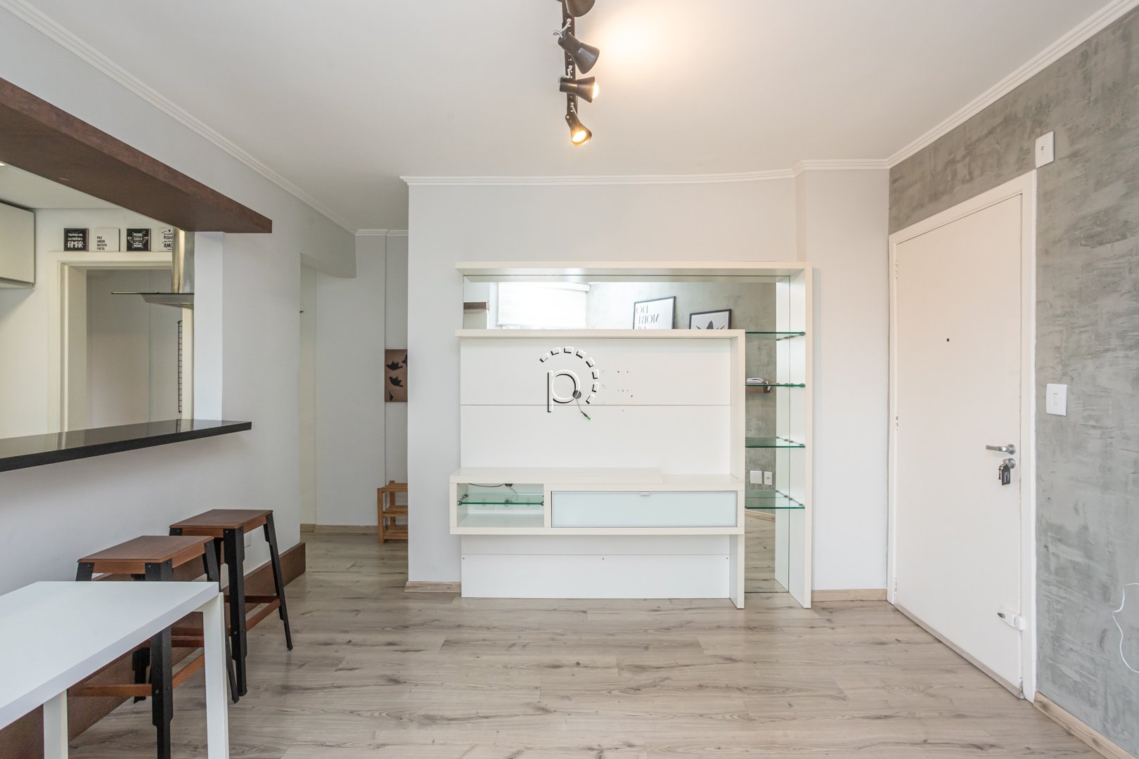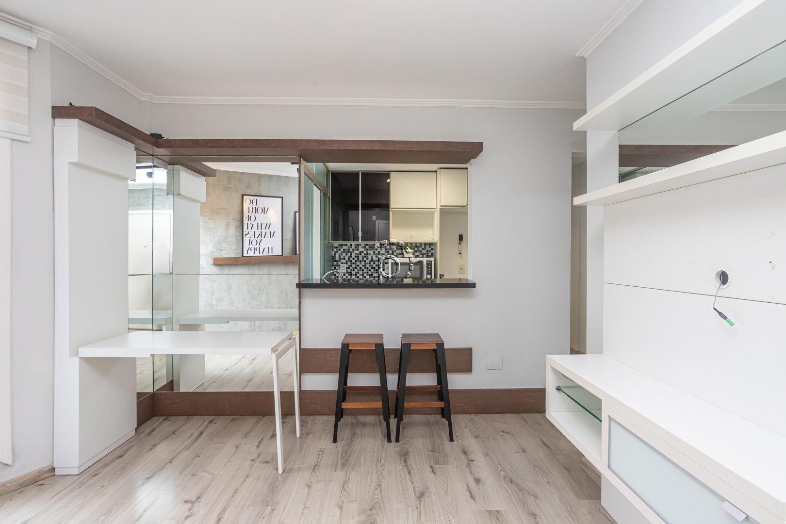 Semimobiliado e com 56m² de área privativa, living, cozinha em conceito aberto, área de serviço, 02 dormitórios, banheiro social e 01 vaga de estacionamento rotativa.