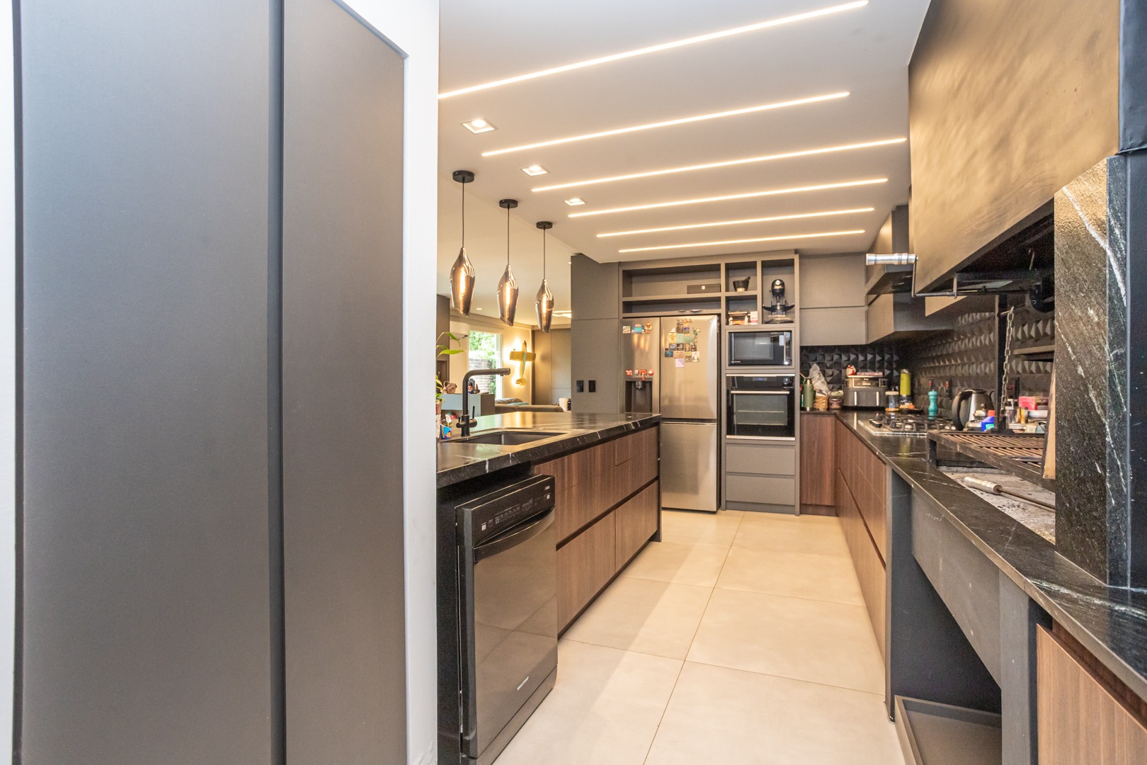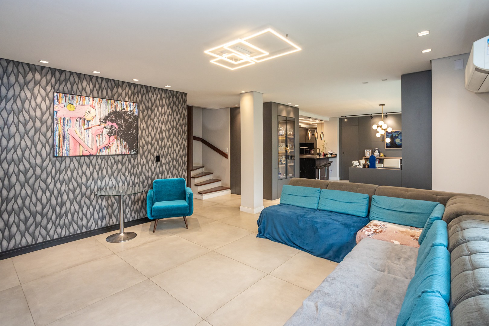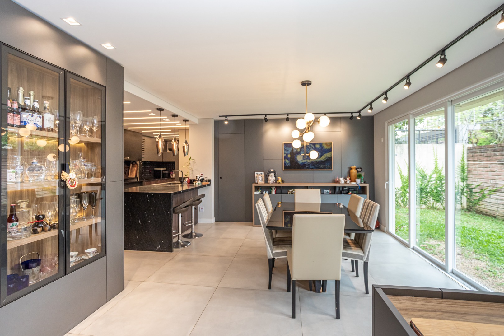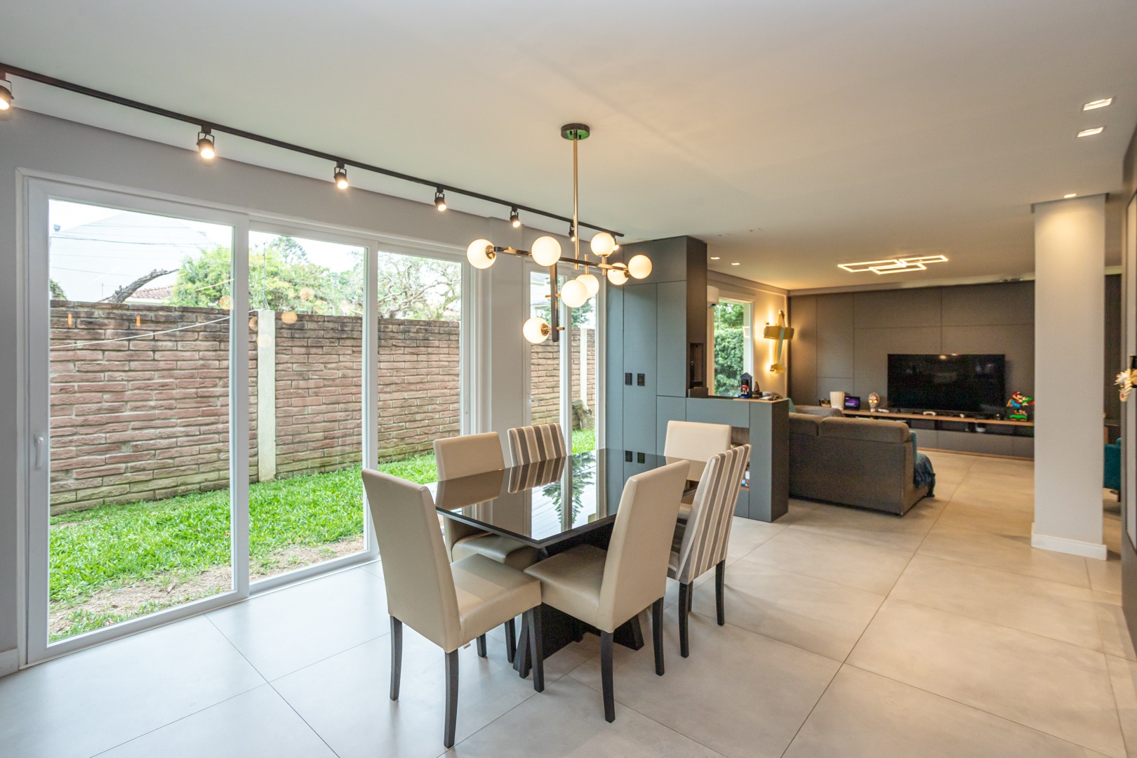 Hall de entrada, Lavabo, Living amplo, Sala de jantar, Cozinha em conceito aberto, Área de serviço, Pátio e Garagem coberta para 2 carros