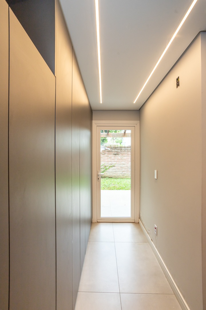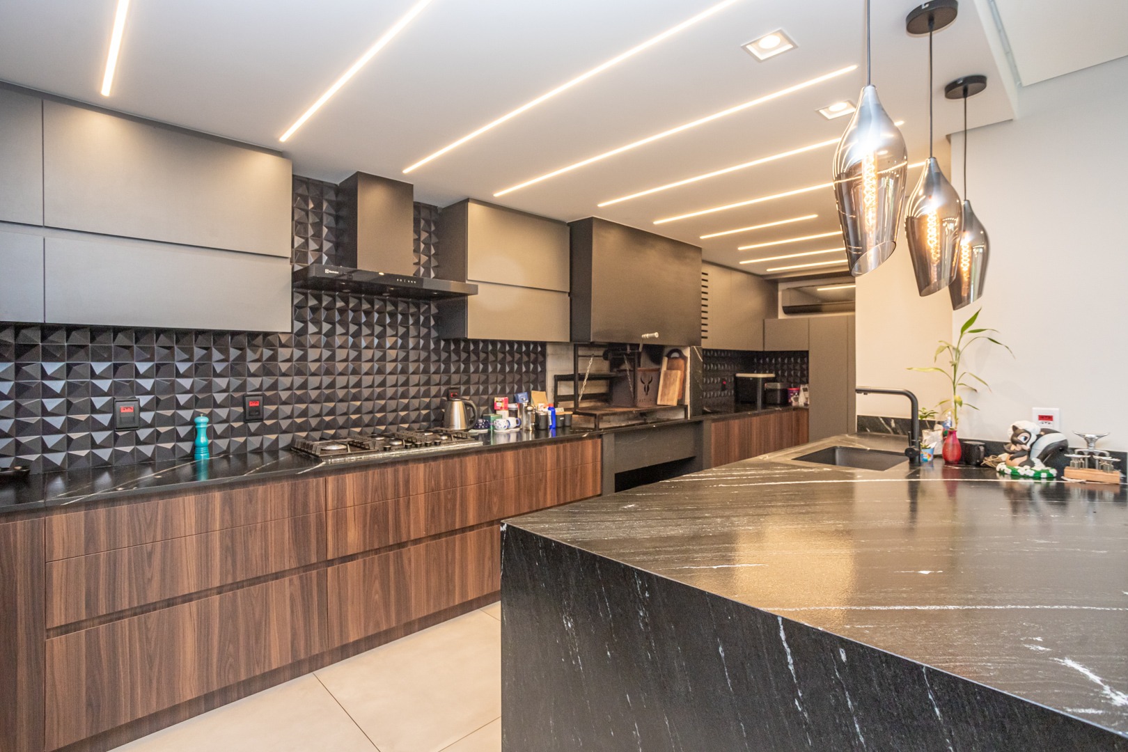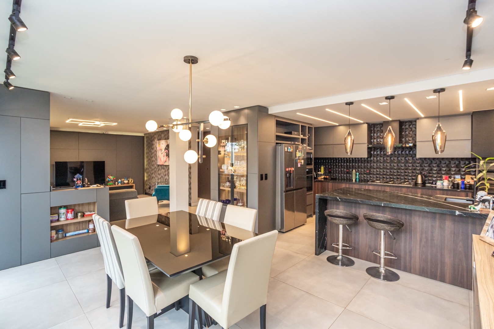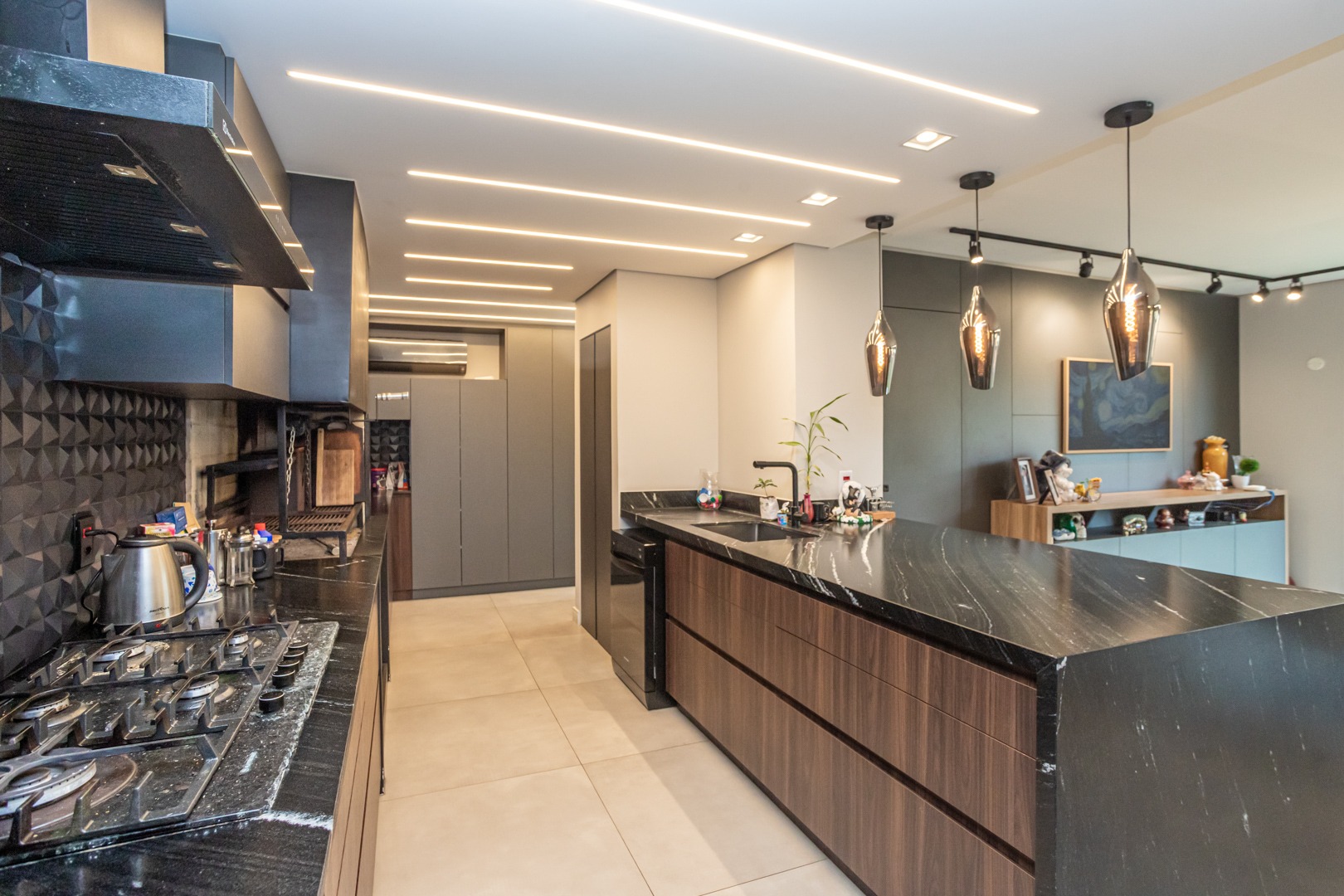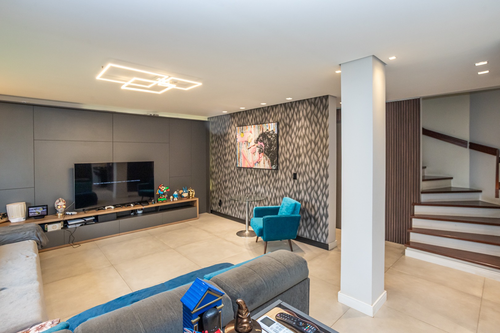 Hall de entrada, Lavabo, Living amplo, Sala de jantar, Cozinha em conceito aberto, Área de serviço, Pátio e Garagem coberta para 2 carros