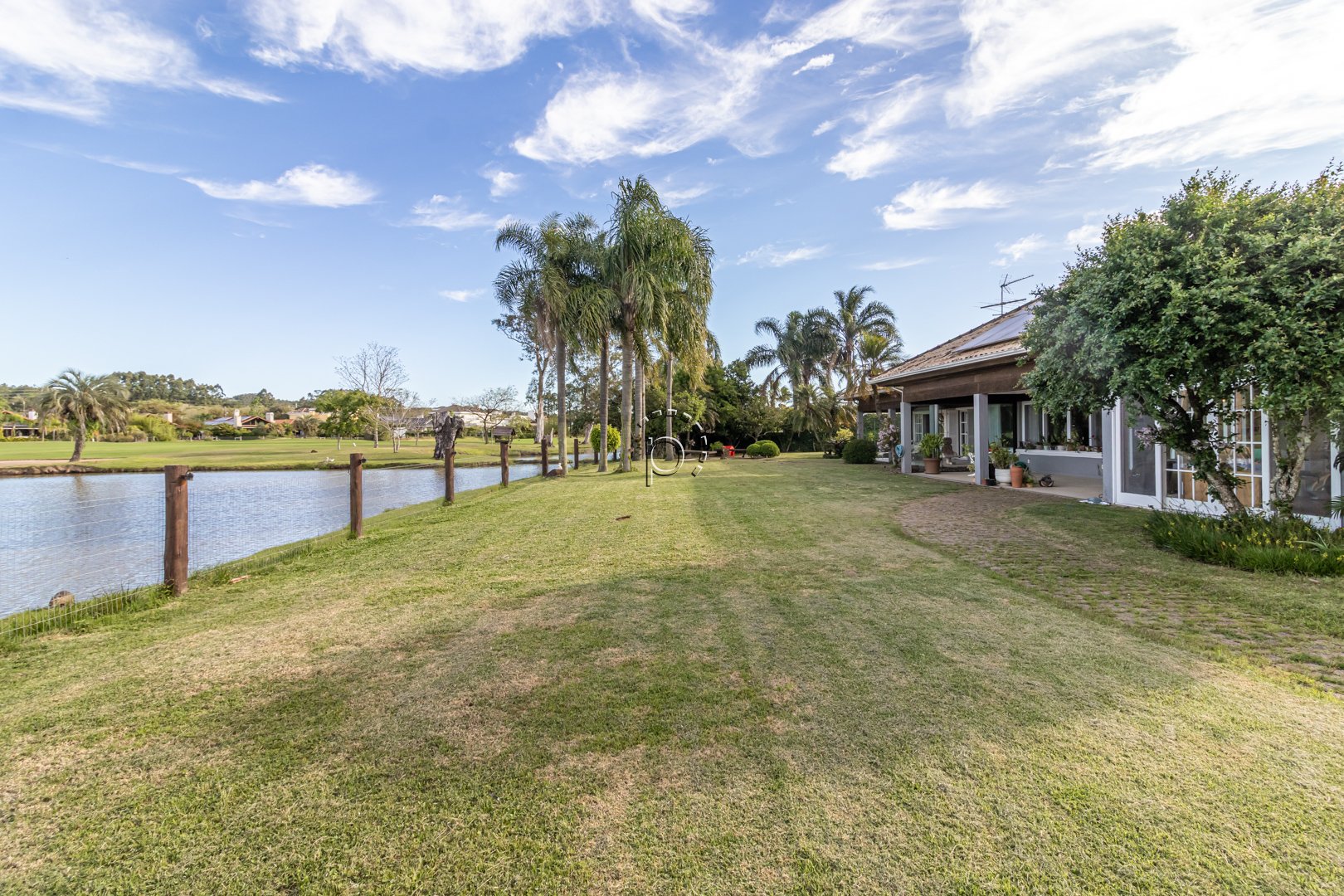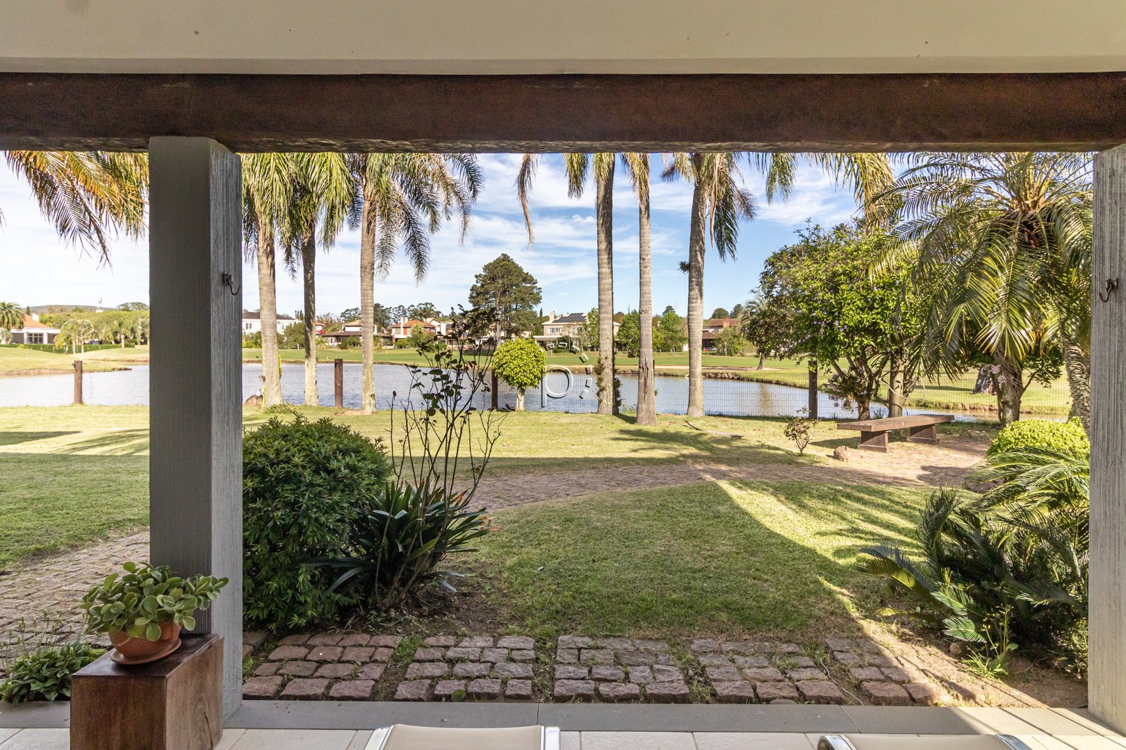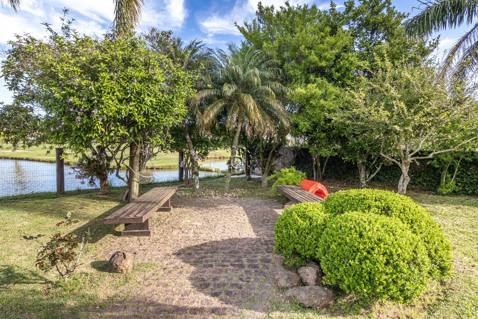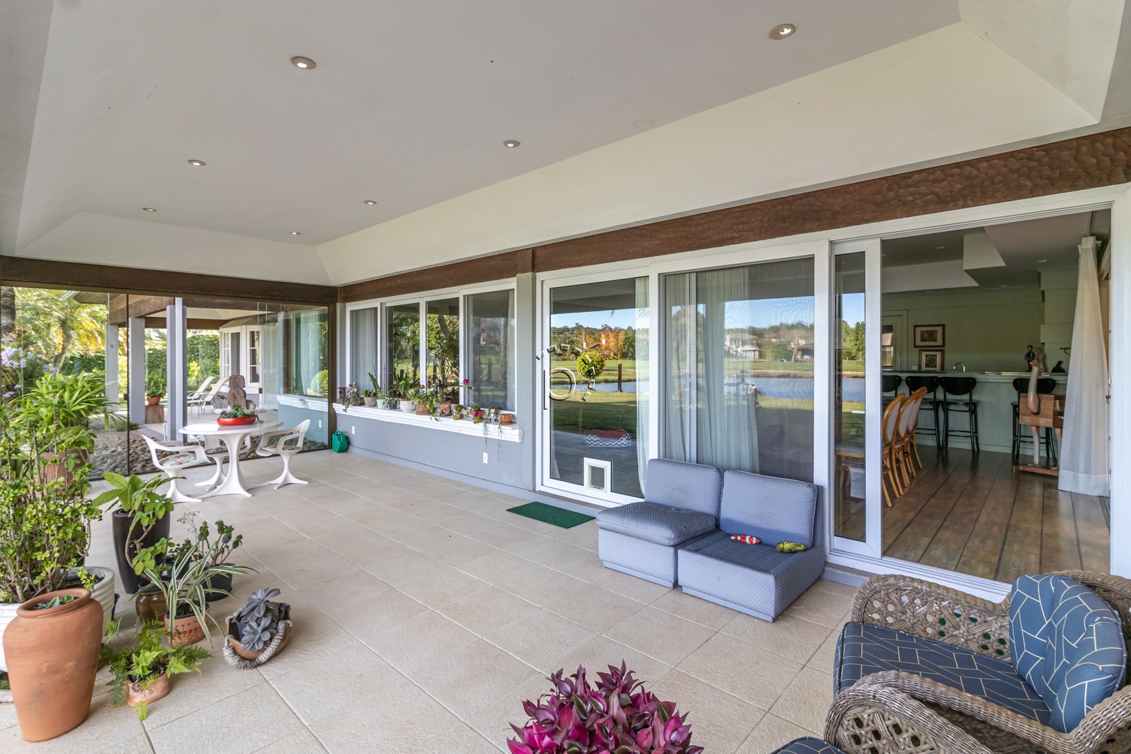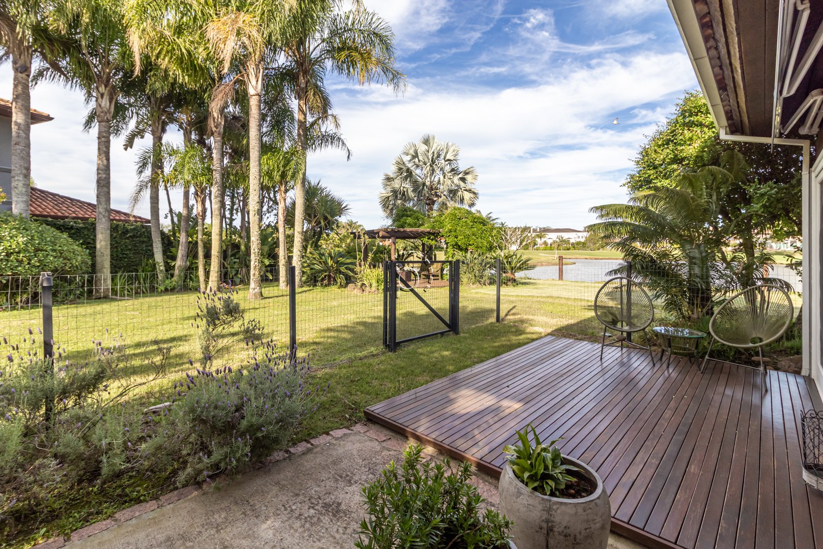 O pátio é um verdadeiro refúgio: paisagismo impecável, recantos de descanso e uma vista panorâmica para o lago e o campo de golfe, proporcionando um pôr do sol diferente e encantador a cada fim de tarde.