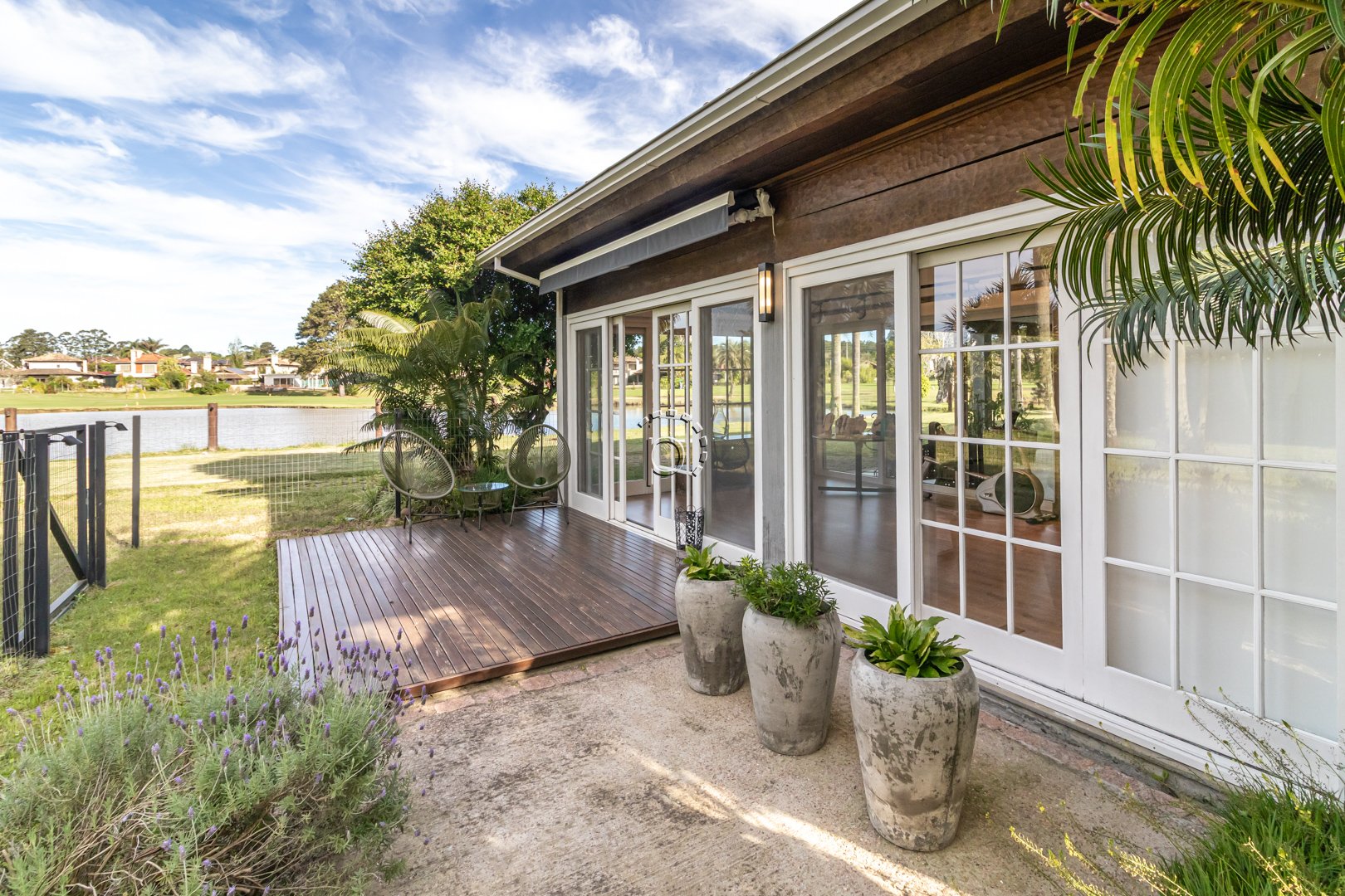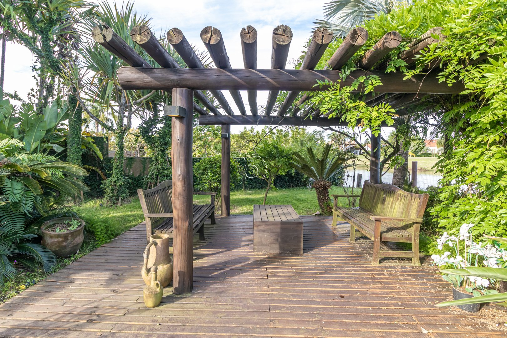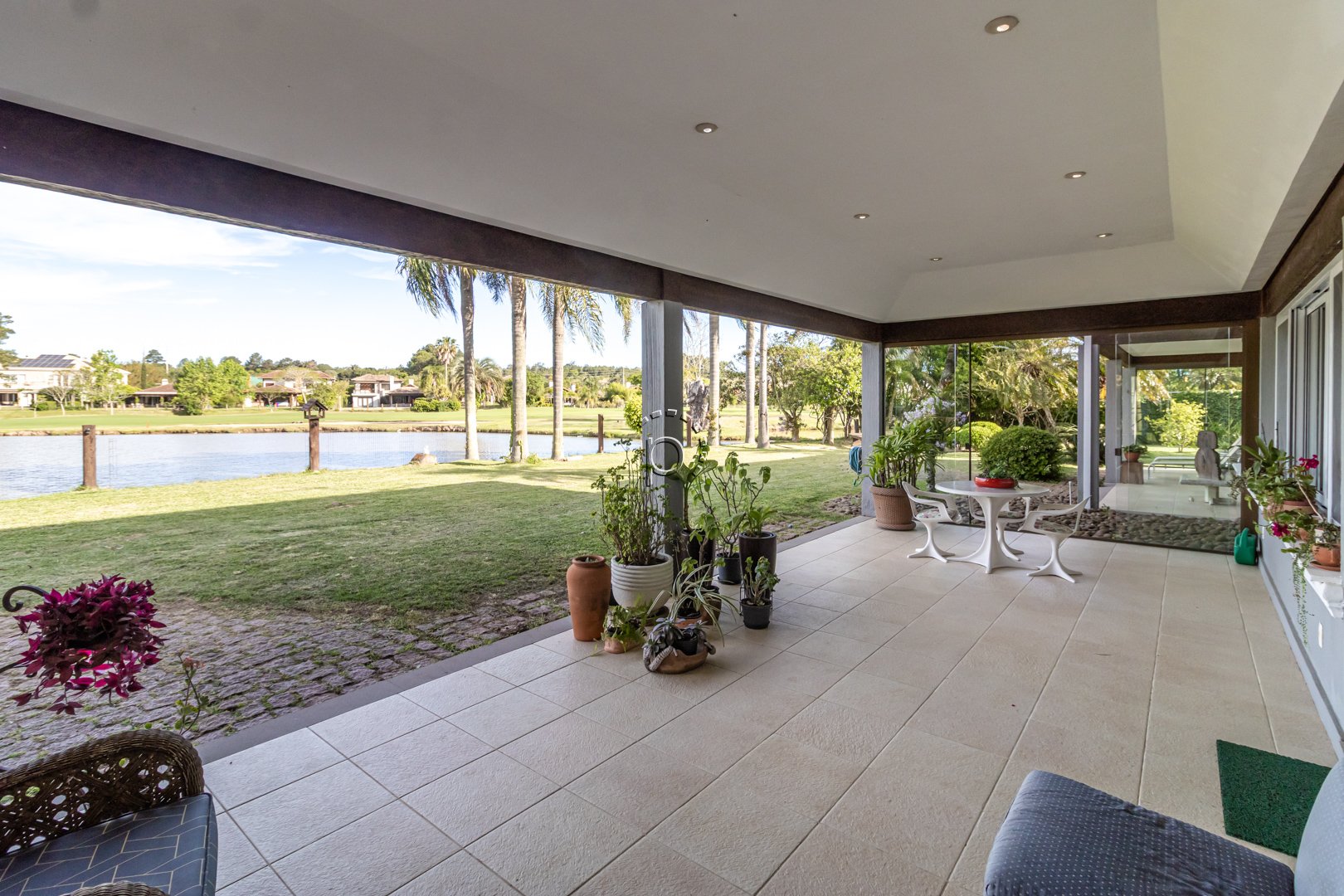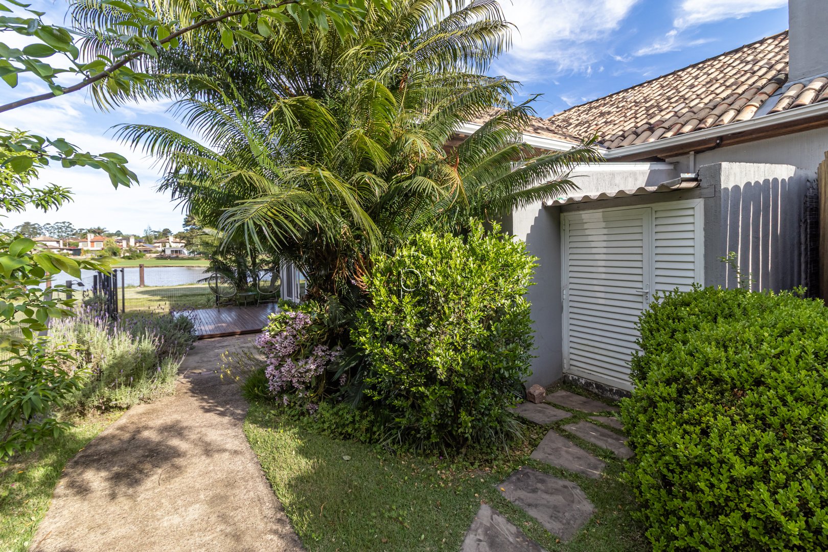 O pátio é um verdadeiro refúgio: paisagismo impecável, recantos de descanso e uma vista panorâmica para o lago e o campo de golfe, proporcionando um pôr do sol diferente e encantador a cada fim de tarde.