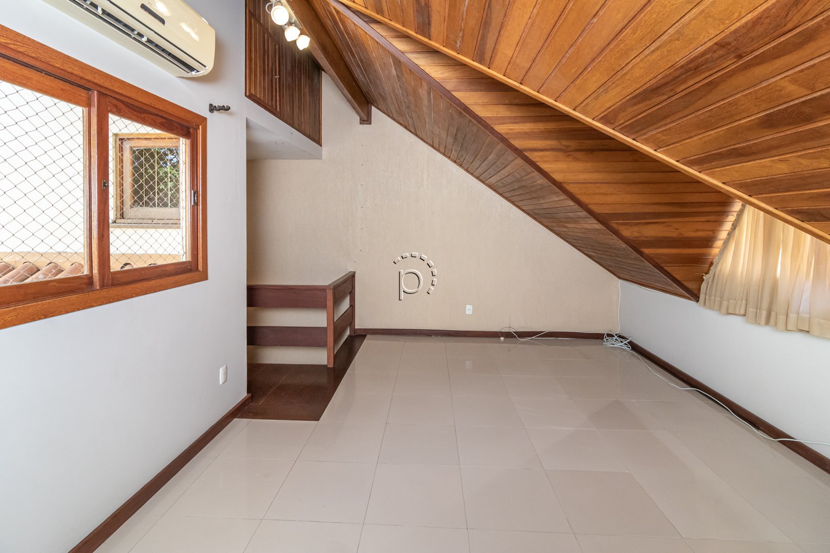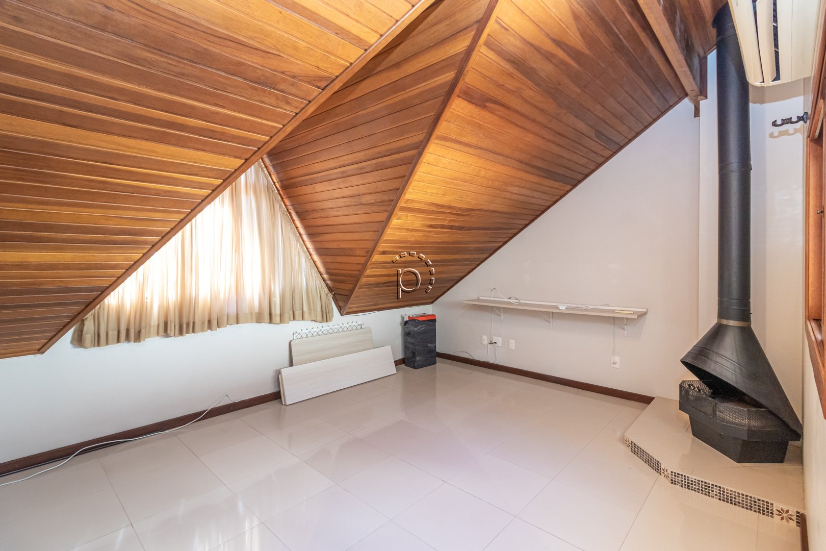 O sótão, também com lareira, é um espaço versátil que pode se transformar em dormitório extra, sala de TV, ateliê, brinquedoteca ou home office, adaptando-se às necessidades de cada família.